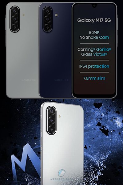 The Samsung Galaxy M17 features a large 6.7-inch Full HD+ display with 1080 x 2340 resolution, offering sharp visuals and smooth scrolling. Protected by Corning Gorilla Glass Victus, the phone is built with a glass front and durable plastic back and frame for daily use. Its slim 7.5mm design and premium colors like Moonlight Silver and Sapphire Black give it a modern look. In terms of photography, the triple camera setup includes a 50MP main sensor with OIS for clear and stable photos, a 5MP ultrawide lens, and a 2MP macro camera for close-up shots. The 13MP front camera supports 1080p video recording, making it ideal for selfies, video calls, and social media content creation. With IP54 dust and splash resistance, dual SIM support, and 5G connectivity, the Galaxy M17 offers complete value in its segment.